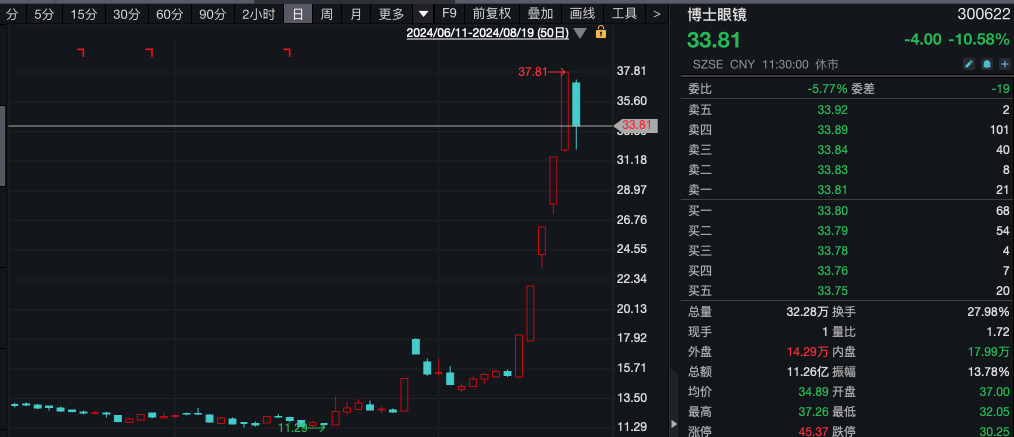 博士学位眼镜开盘下跌10.58%,报33.81元/股,半天成交11.26亿元。