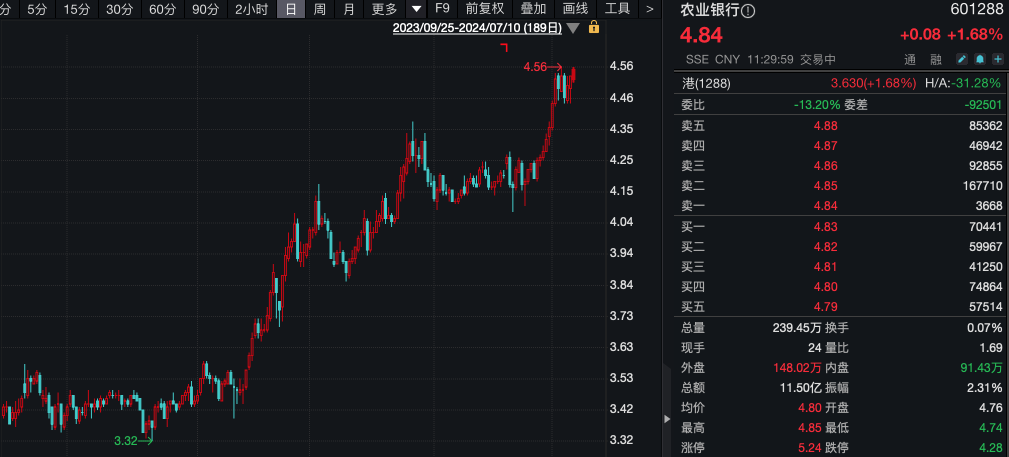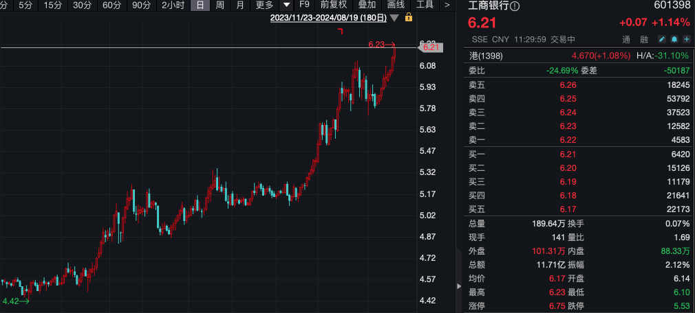 据统计,A股工商银行年内累计上涨37%,农业银行年内累计上涨40%,中国银行年内累计上涨29%,建设银行年内累计上涨30%。