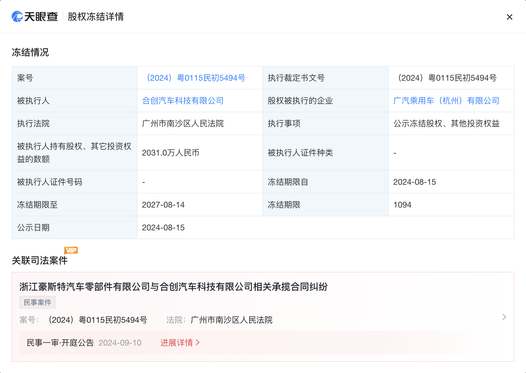 据《国家商报》记者查询,合创汽车部分股权被冻结,与债务诉讼有关。例如,案件编号为(2024)粤0115民初5494号股权冻结,其相关司法案件为浙江豪斯特汽车零部件有限公司与合创汽车科技有限公司有关合同纠纷。