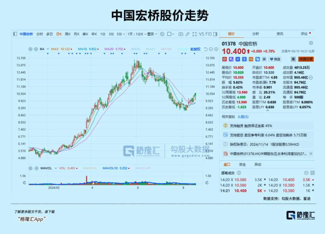 而且港股的另一家铝巨头中国宏桥(01378)上周还披露了中期财务报告数据,上半年实现收入735.92亿元,同比增长12.0%,报告期内净利润达到100.08亿元,同比增长236.7%,明显高于之前公司业绩预测的220%。