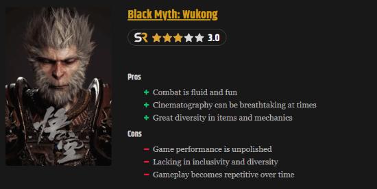 众所周知,在国外政治正确高于一切的情况下,很多媒体都给了《黑神话:悟空》一个低分。国外媒体screenrant对这部作品进行了3星评价(满分5星)。在这次媒体评价中,“缺乏包容性和代表性”成为了游戏的扣分项目。