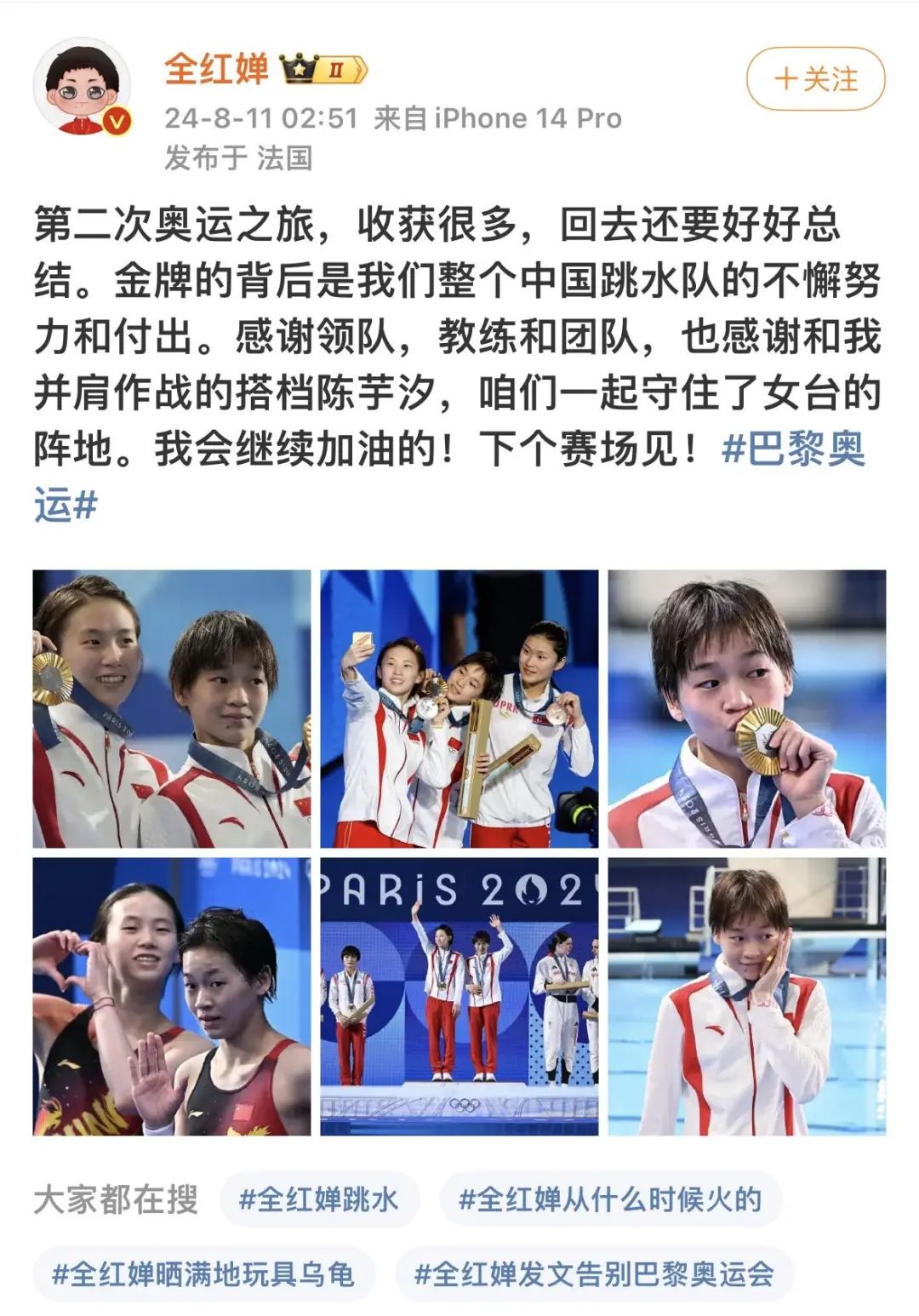 在巴黎奥运会女子10米跳台跳水决赛中,《水花消失》再次上演,以425.60分的高分卫冕冠军也打破了伏明霞的纪录,以17岁131天成为中国奥运会历史上最年轻的“三金王”,再次为国家增添光彩,人气和人气不容小觑。