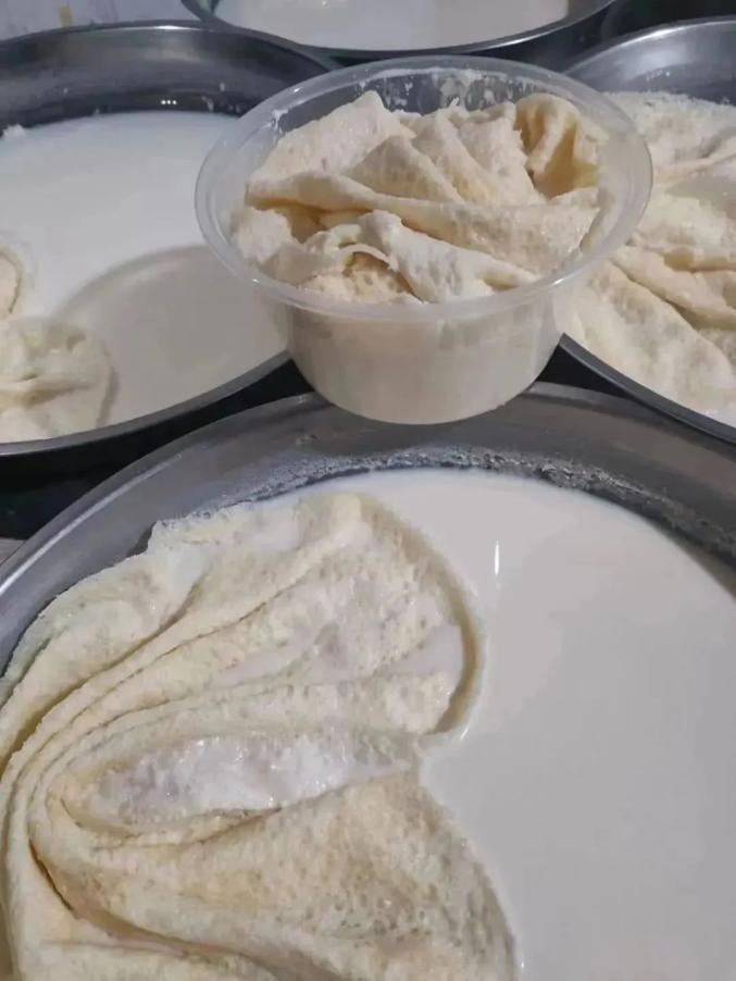 当地人也喜欢吃牛奶面,在锅里煮鲜奶,凝结一层牛奶皮。当他们把它们捡起来晾干时,他们会有牛奶皮,可以冷冻食用,也可以烘烤食用。浓浓的牛奶味让人上瘾!