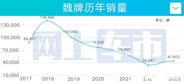柳燕在位的 2018-2019 2008年,是魏牌的高光阶段,持续 2 年销量超过 10 万台!2020 年初以来,魏牌销量迅速下滑,直至 2022 年只售出 3.6 万台!2023 年陈思英接手后,魏牌终于实现了逆转,年销 4.1 万台,同比双位数增长。