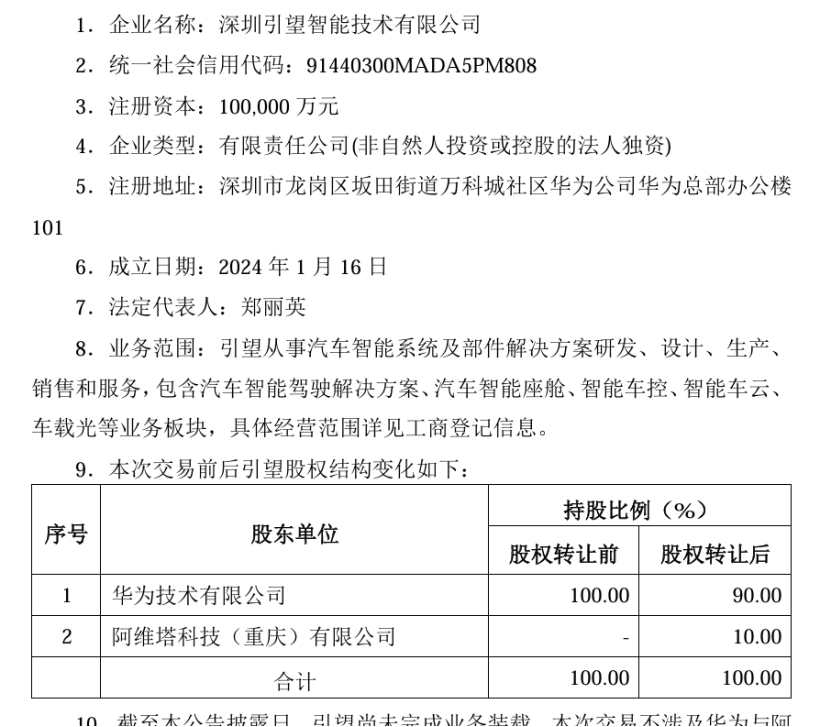 今年1月,深圳期待智能技术有限公司成立,法定代表人为郑丽英,注册资本10亿元,经营范围包括智能车载设备制造、智能车载设备销售等。在成立之初,华为技术有限公司持有100%的头寸。