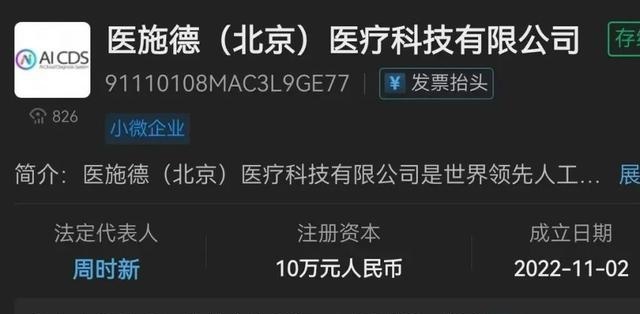 根据企业调查,医施德(北京)医疗科技有限公司成立于2022年11月2日,注册资本10万元,法定代表人为周时新。公司大股东为自然人周紫涵,持股比例100%;周时新担任执行董事,周紫涵担任监事。
