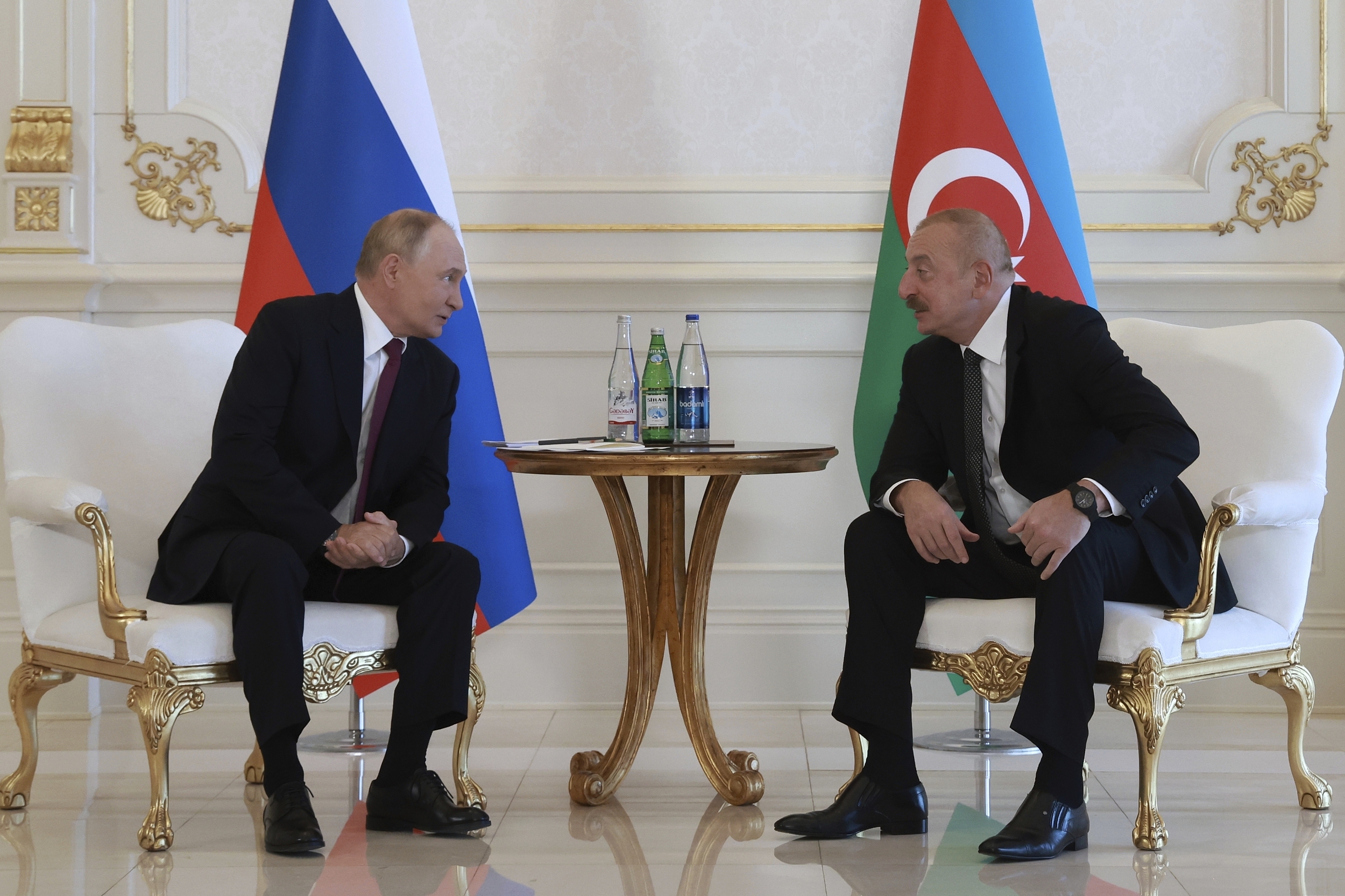 2024年8月19日,阿塞拜疆巴库、俄罗斯总统普京(左)与阿塞拜疆总统伊利哈姆·阿利耶夫(右)举行会谈。视觉中国 图