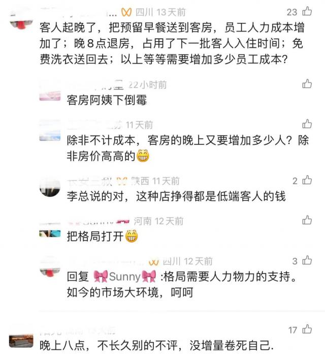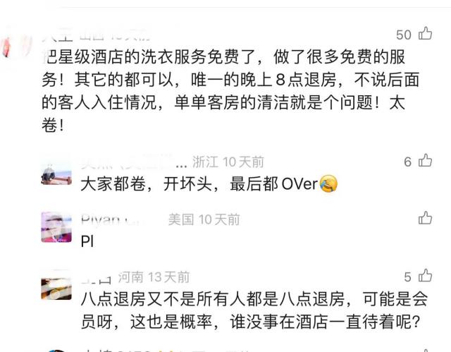 然而,有些人赚了钱,但行业的指责声音不小。大家的态度都是“太卷”。有人认为预留早餐送到客房大大增加了人工成本;有些人认为 20:00 退房增加了员工夜间工作的时间…