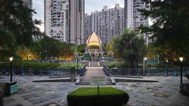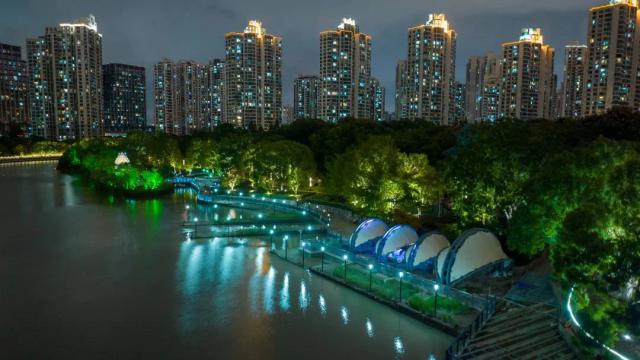 晚上,水杉走廊被月光和灯光照亮,每一步都伴随着光影的交错和凉爽的微风。公园里的水渠潺潺流淌,为这个安静的夜晚增添了许多活力和活力。