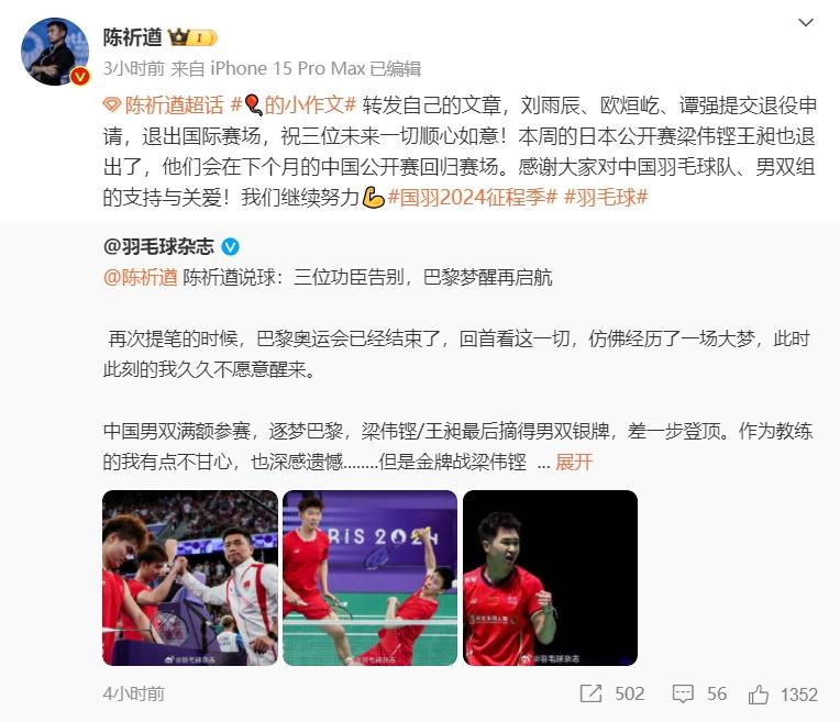大家好,我是刘雨辰。虽然我不想,但这一天终于到来了...一个一心想成为毛毛球国王的少年,不得不向毛毛球挥手告别!作为中国羽毛球队的一员,我很荣幸能在这个群体中获得无数的荣耀!……最后㊗️全国羽毛球队越来越好,勇攀高峰!