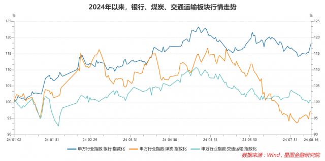事实上,2024年作为中证红利指数的前三大权重行业, 到现在,银行(权重) 21.5%)、煤碳(权重 16.3%)、运输(权重) 13%)近期板块走势明显分化。其中,利润韧性较强的银行板块,股价走势最为坚韧;然而,本期利润大幅下滑的煤炭板块已经成为红利指数下跌的重要连累项目。