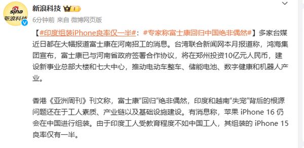 专家说,富士康回到中国绝非偶然。 iPhone在印度制造的良率太低