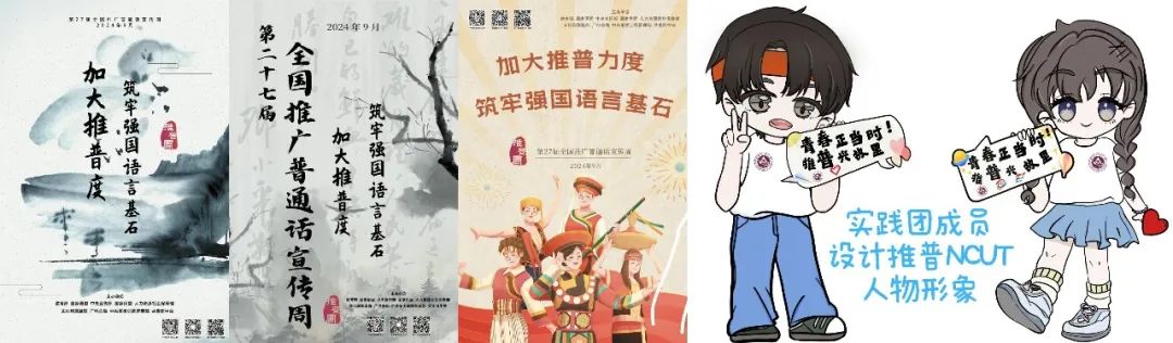 与此同时,实践小组成员通过实地调查走访,感受当地风土人情,根据当地少数民族文化创作外宣材料。最终画出2幅“推普惠乡村、民族大团结”的墙绘板报,创作NCUT推普卡通人物IP形象、制作正安白茶产品3种外包装,绘制正安农业特产,10张“有声”推广海报,编辑创作5个“普润心田”宣传视频,创作8个主题的系列文化创作作品。