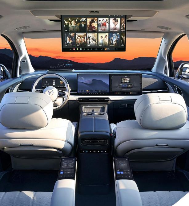 仔细数一数这个 8 块状屏幕分布,29 英尺 AR-HUD 10.25抬头显示 双驾屏由英尺液晶仪表屏、中控屏和副驾屏组成。 15.4 英尺联屏,仅驾驶室就有 4 屏幕。另外,驾驶室和后舱之间的车顶悬挂着一块 17.3 英尺 3K 娱乐屏幕,二排两个独立座椅各有一个。 6 英尺扶手屏,以及冰箱控制屏。