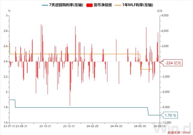 央行 8 月 19 日以固定利率、数量招标方式进行 521 亿元 7 天期逆回购操作,操作利率为 1.7%。Wind 数据显示,当天 745 逆回购到期1亿元,由此计算,单日净回笼 224 亿元。