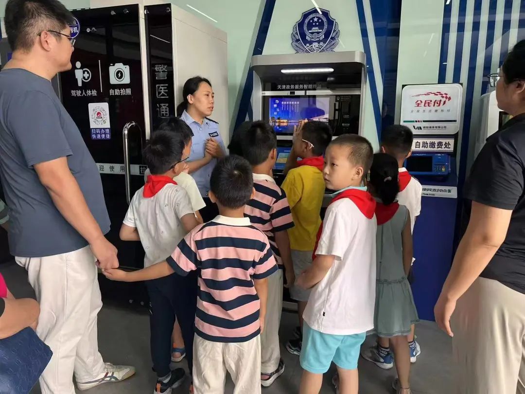 儿童在户外实景体验中,首先来到自助大厅,化身为“司机”,对交通管理服务的便利性进行现场评估。在这里,需要办理有效期届满换证业务的司机,只要拿出身份证,进入体检机,按照语音提示操作,完成自动拍照,一会儿就能拿到“热”驾照。哇,这个地方太神奇了,就像变魔术一样,不到15分钟就能搞定。在成为“导游”的过程中,交警还介绍了驾照有效期届满换证的时间规定、工作流程和逾期未换证的违法后果,让家长收获颇丰。然后出现的摩托车和铁骑交警让人睁不开眼睛。酷炫的警用装备展示让孩子们大饱眼福,甚至争先恐后地向近在咫尺的交警叔叔学习交通指挥手势。