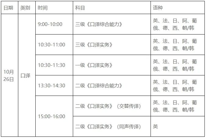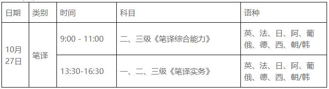 英语、日语、俄语、德语、法语、西班牙语、阿拉伯语、朝鲜语、韩语等专业翻译资格(水平)考试。/韩语、葡萄牙语等9种语言,每种语言分为一、二、三个等级,每种语言、每个等级都有口译和翻译考试。考生必须在本次考试中通过所申请的语言、等级的口译或翻译科目,才能获得相应的资格证书。