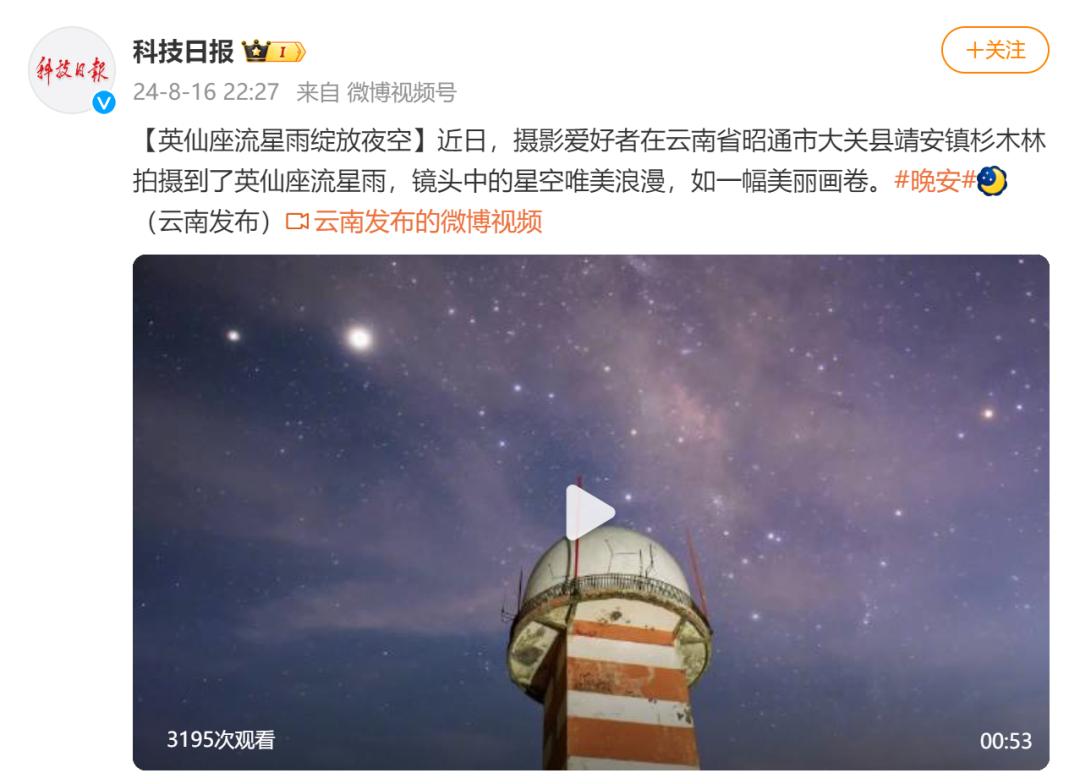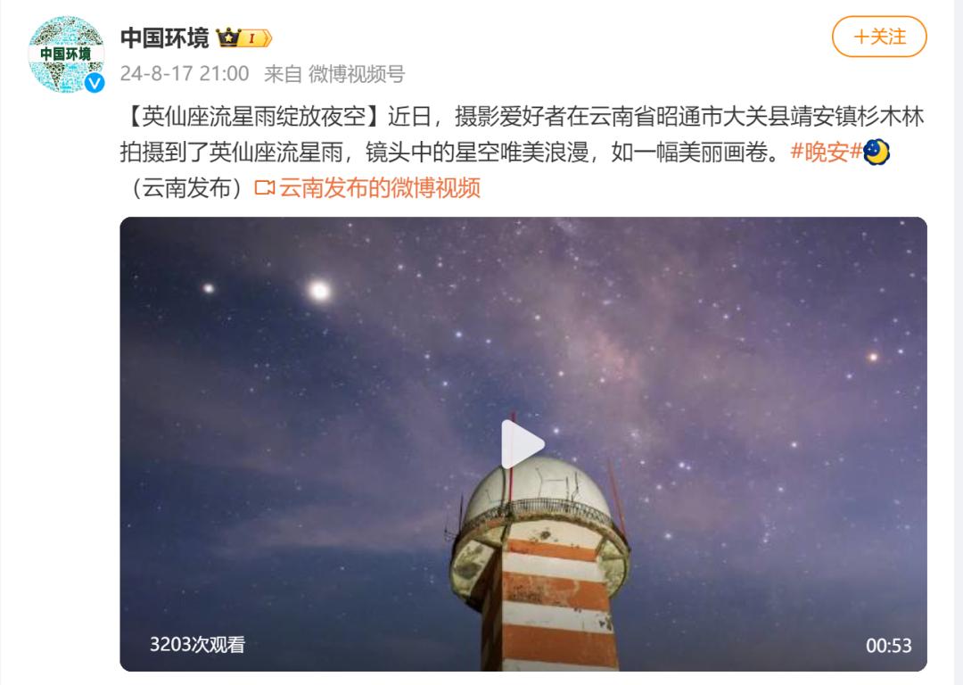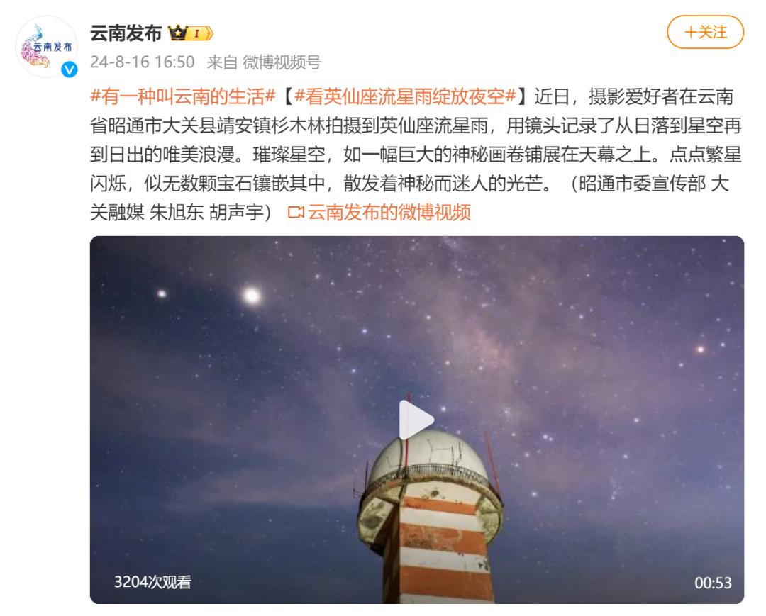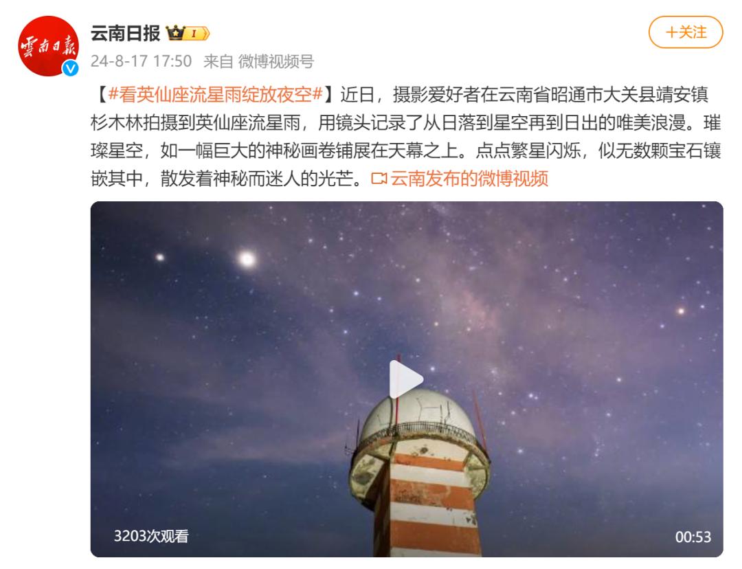 由科技日报、中国环境等微博平台转载的云南微博发布的稿件《英仙座流星雨绽放夜空》。