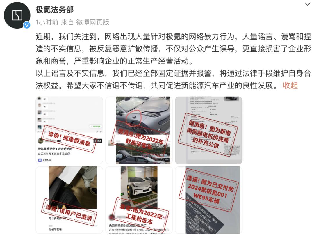 八月十九日上午,@极氪法务部 声明称,近日,网络上出现了大量针对极氪的网络暴力行为和谣言的恶意传播,不仅误导了公众,也损害了极氪的企业形象和声誉,严重影响了公司的正常生产经营活动。@极氪法务部表示,证据已固定并报警,将采取法律手段维护合法权益。(红星新闻)