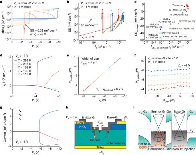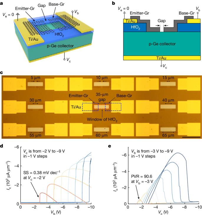 作者报告了一种混合维热发射极晶体管,基于双石墨烯/邈肖特基结。(HOET)。晶体管本质上是由一种含有缺口的单层石墨烯制成的。(Gr)构成了一个p型Ge衬底。Gr通过HfO2窗口接触Ge(HfO2)。两个单独的Gr层被用作发射极(emitter-Gr)和基极(base-Gr),Ge衬底作为集电极(图1a)、b)。该设备采用Gr转移和标准半导体工艺制造。Gr中的缺口采用光刻技术制造,缺口长度为2μm至75μm(图1c)。对晶体管而言,传输特性(Ic-Vb)中集电极电流Ic与基极电压Vb的关系突然发生了电流变化,超过了玻尔兹曼的极限,其中亚阀值摆幅(SS)低于1 mV dec−1(图1d),输出特性(Ic-Vc)NDR峰谷电流比例与集电极电压Vc的关系显示(PVR)大约100(图1e)。