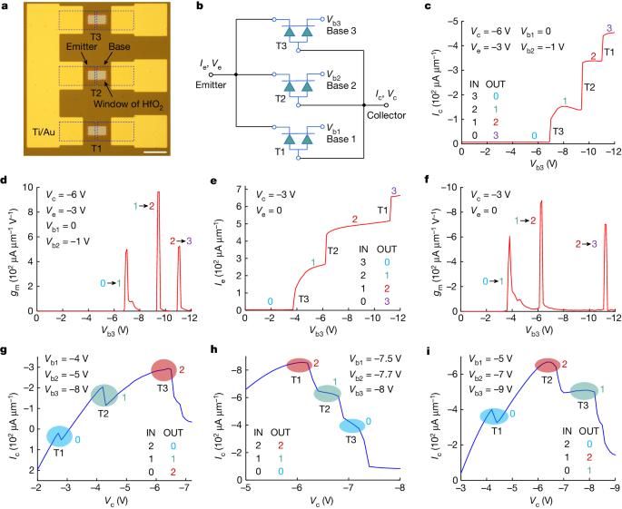 多功能HOET在各种应用中具有广阔的前景。作者使用三个HOET(T1-T3)与共发射极、共集电极(Ge衬底)和独立基极1-3并联制作电路,并由等效电路和设备符号表示(图4a)、b)。作者使用基极电压作为输入信号,以示高反相器的增益。(IN,例如,Vb3,并且集电极电流Ic作为输出信号。(OUT;图4c)。第一,当Ic突变引起逻辑状态变化时,反相器增益gm(跨导dIc/dVb3)较高,接近1 mA μm−1 V−可以用来制作低功耗MVL(图4d)。第二,可以并联更多的HOET,使用简单的结构实现五进制甚至更多的进制系统。第三,Ie对Vb3的依赖也是四进制反相器的行为,为电路原理提供了更大的灵活性(图4e、f)。