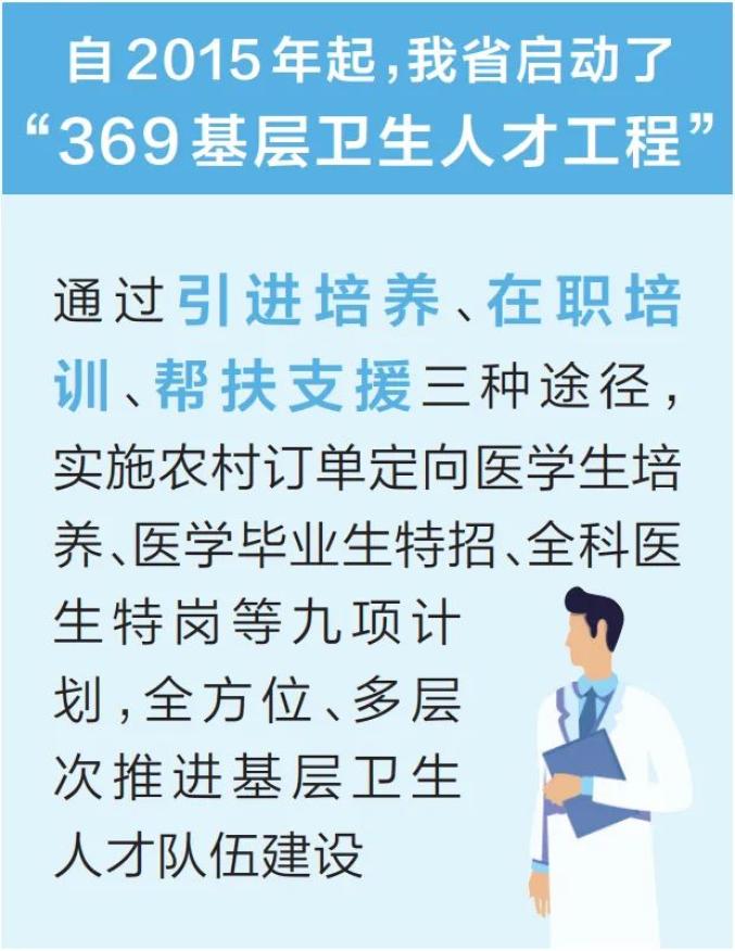 据省卫生健康委相关负责人介绍,自2015年起,我省启动“369基层卫生人才工程”,实施农村定向医学生培养、医学毕业生特殊招聘、全科医生特殊岗位等9项计划。通过引进培训、在职培训和支持支持,全方位、多层次推进基层卫生人才队伍建设。