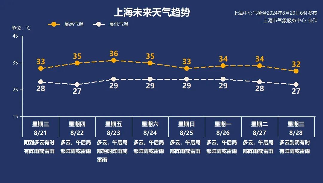 八月二十一日(星期三):阴天有时会有阵雨或雷雨,28~33℃