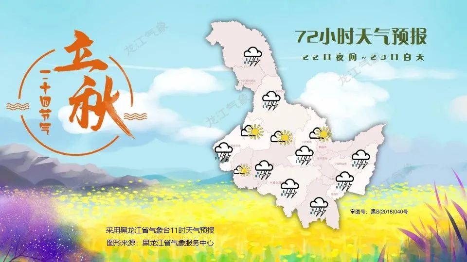 22日晚至23日白天:大兴安岭、黑河北部、伊春南部、齐齐哈尔南部、绥化南部、哈尔滨、佳木斯、双鸭山、七台河、鸡西、牡丹江阴天有阵雨或雷暴,其他地区多云转晴。