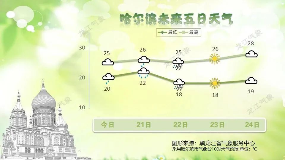 21日晚至22日白天:21日晚木兰、通河、尚志、延寿、宾县、方正、五常中至大雨,其他区域小至中雨,22日白天木兰、通河中雨,其他区域小雨;西南风转向西风2~三级;最低温度21~23℃,最高温度24℃~27℃。