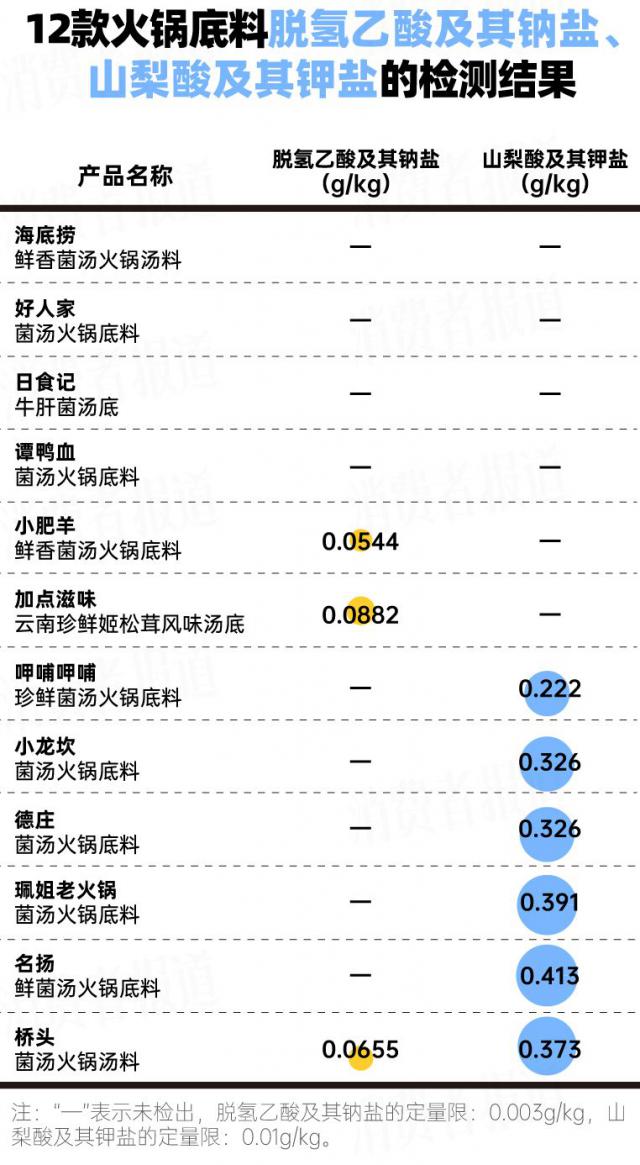 此外,还有 4 上述火锅底料未检出。 2 一种常见的防腐剂,包括海底捞、好人家、日食记、谭鸭血。