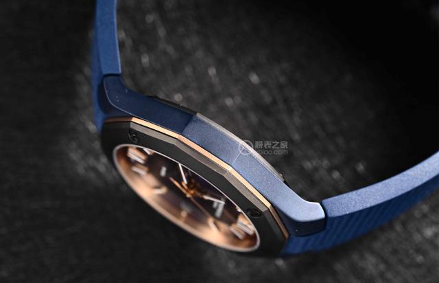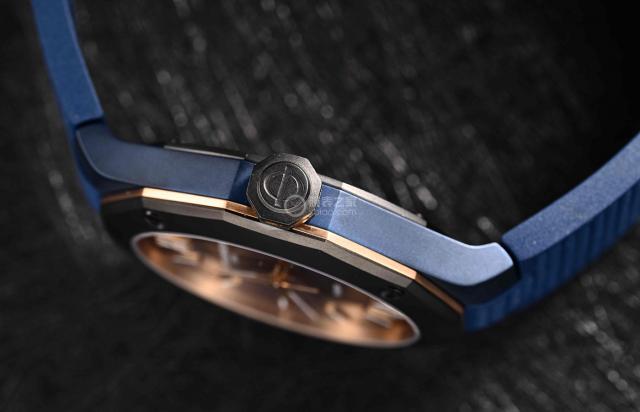 这个表壳的直径是 42 mm、薄厚 10.6 mm,对休闲运动风格的手表来说,还是相当纤细的。手表的另一边,一个选择 ADLC 碳涂层精钢材质表也采用多边形设计,与表壳形状相呼应,也方便掌握调整时间。在顶部标记装饰 Phi 品牌标志浮雕,镀金线条。