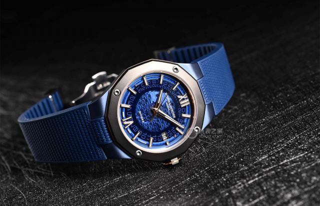 从手表的侧面,我们可以非常直观地看到其层次分明的表壳设计。其实这是因为这个全新的作品采用了不同类型的应用组合。灰表圈和表后盖使用灰色表圈。 PVD 镀层钛金属材料,而表壳则采用蓝色。 PVD 镀层精钢材料,为使两种材料更好地结合,表面均采用微粒喷砂工艺,使表壳呈现磨砂质感。而且表壳和表圈之间有配置 PVD 镀金刚性表环,与表盘上的时标相对应,为手表增添了一丝奢华与精致。