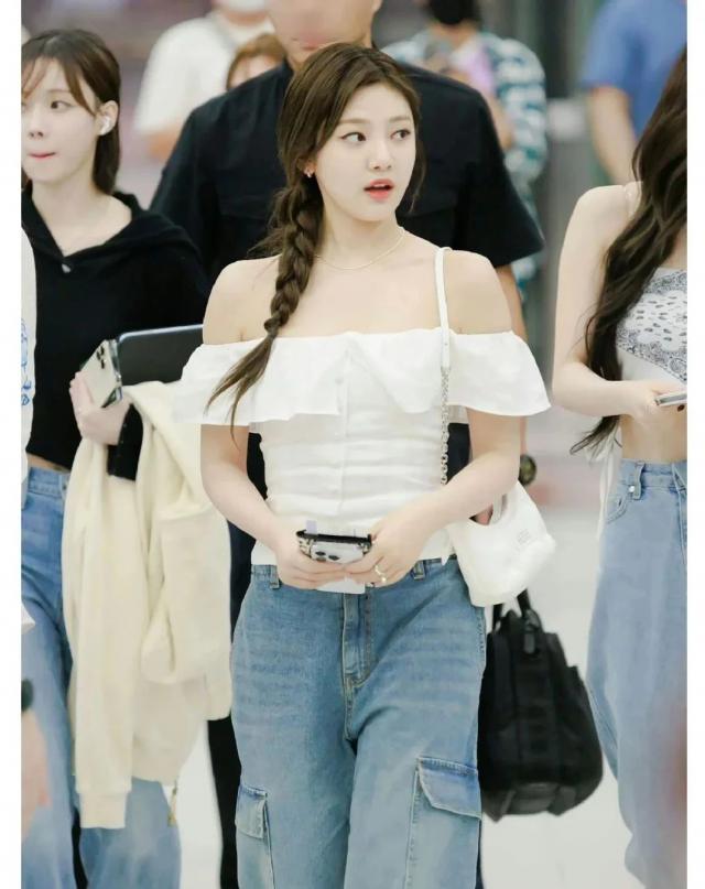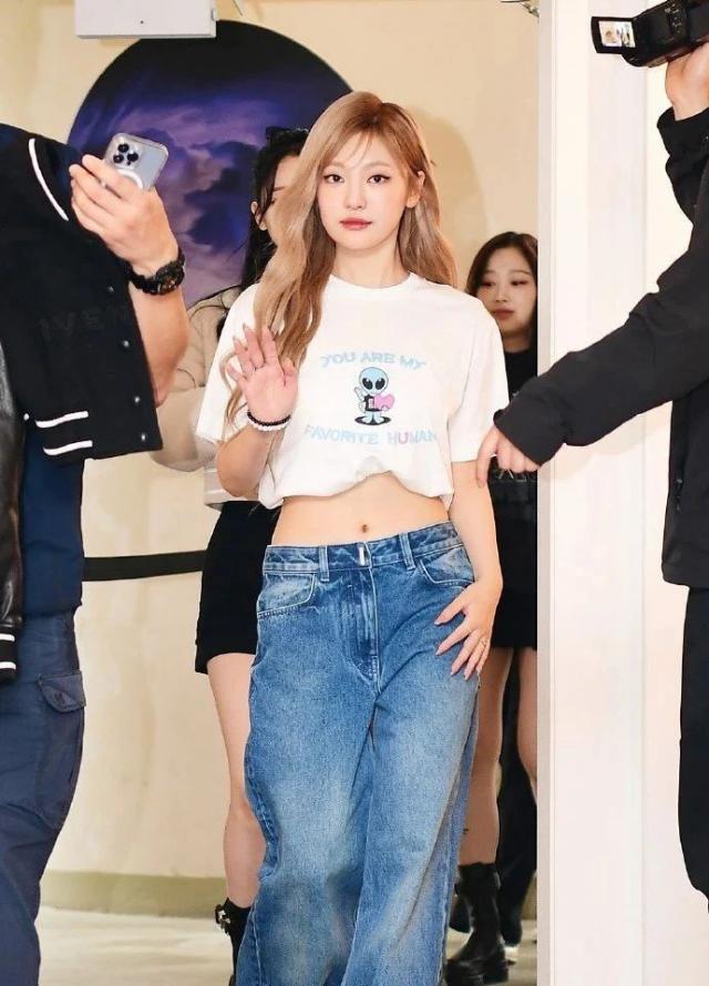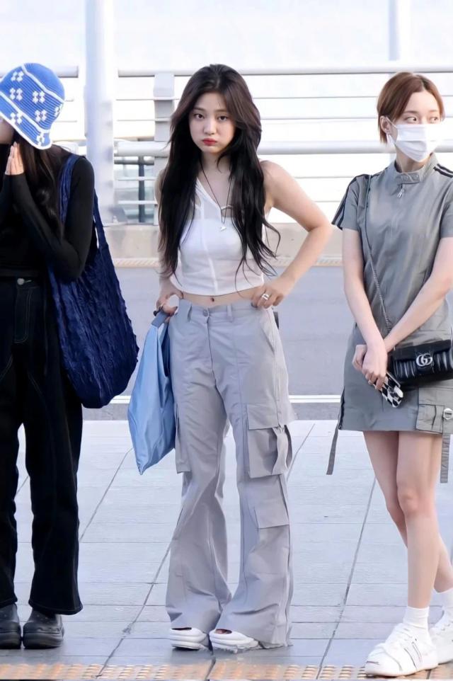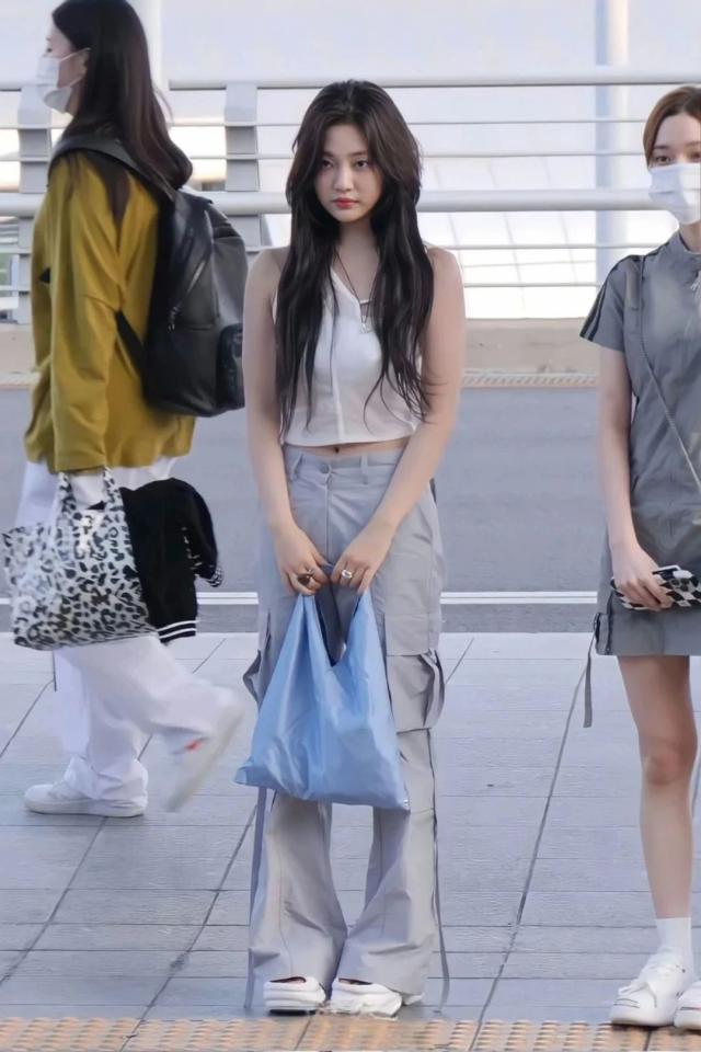 但是实际上这条裤子对她来说还是有点太宽了,没有露出腰线,反而看上去像是梨形身材。