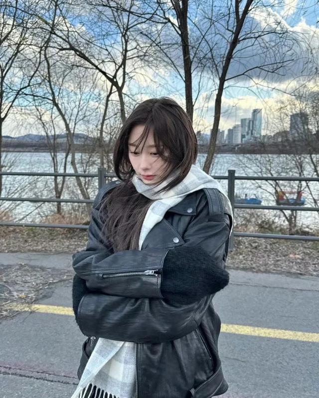 穿着整套黑色会显得闷闷的,所以她用了。浅色格子围巾增加服装的趣味性。