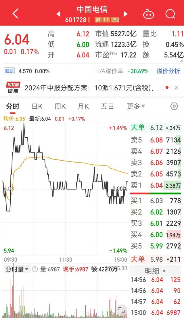 截至 8 月 20 日收市,中国电信报 6.04 元,当日涨幅 0.17%,市值 5527 亿元。