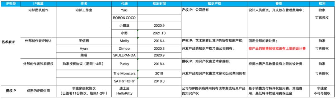 从IP的角度来看,泡泡玛特主要分为自己的IP。、独家和非独家IP,其中独家IP和独家IP是泡泡玛特的核心竞争优势。上一次披露规格调整后,独家IP和独家IP统称为艺术家IP。一般来说,这种IP的毛利率更高。