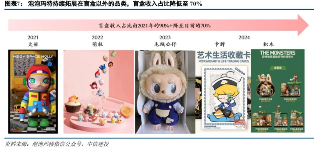 而且在品类上,泡泡玛特现在玩的花样比较多。除了手工制作,大娃娃在国外市场也很受欢迎。此外,它还制作了萌粒、毛绒娃娃、卡片甚至积木等。凭借线下公园的感觉,泡泡玛特似乎正在向更多的泛娱乐领域迈进。