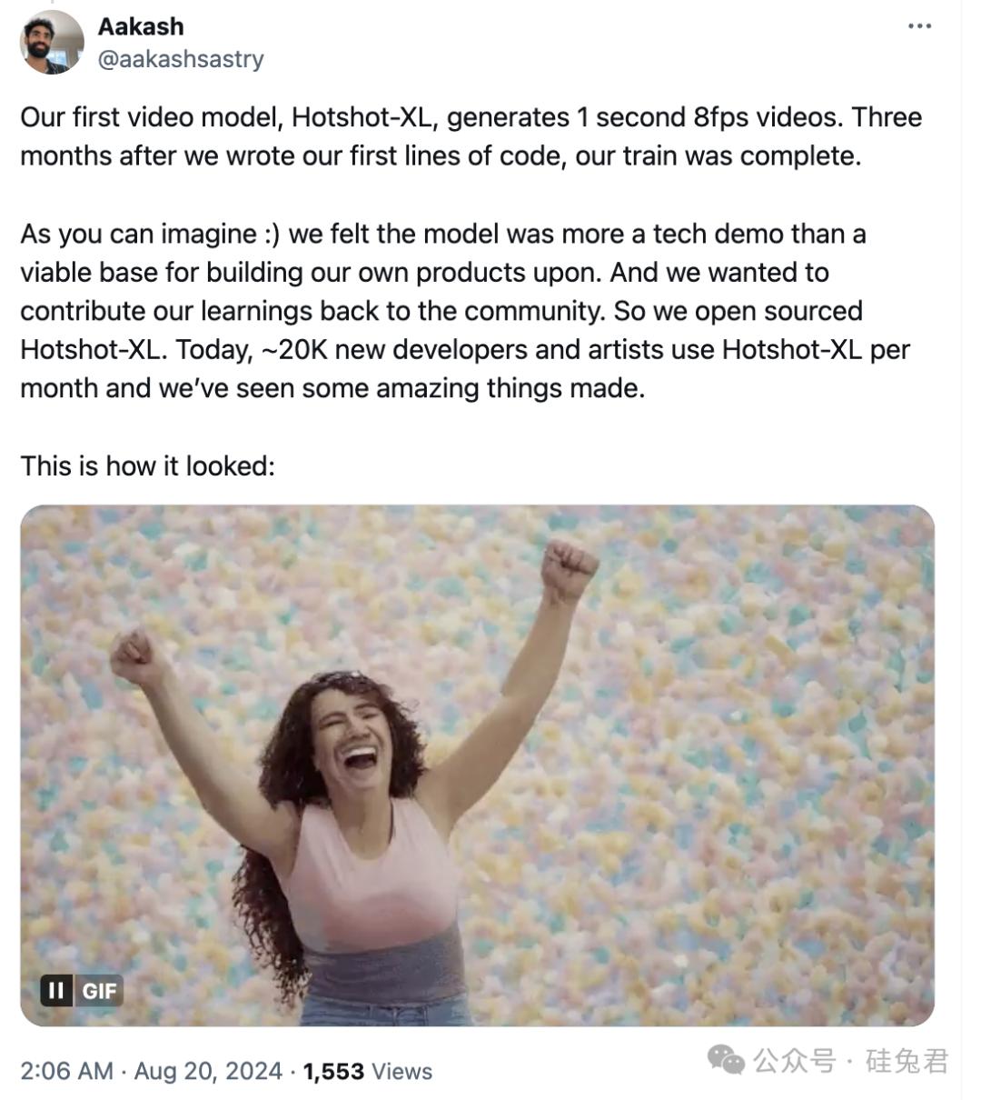首个视频模型Hotshots-XL 可生成1秒8fps的视频,开发过程只需3个月。