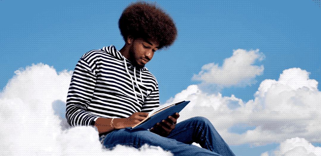 举例来说,这是一段“一名20岁的男子坐在棉花云端,在蓝天上看书”的视频。