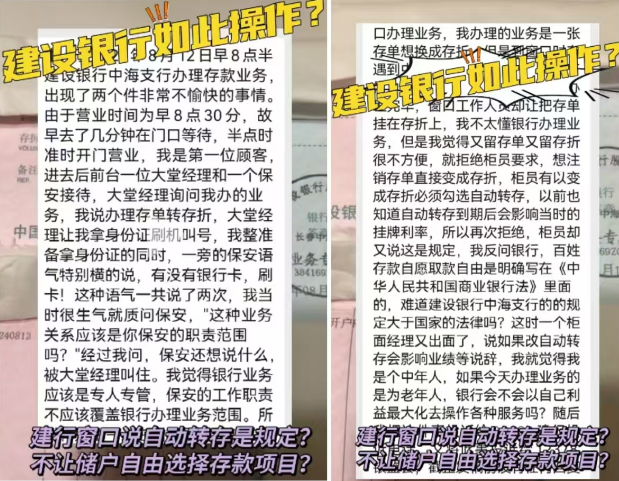 一家储户投诉建行强制自动转账,官方客服回应。|银行财眼