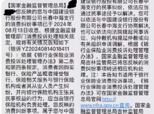 八月十三日,该储户向国家金融监管总局吉林监管局投诉建行长春中海支行。