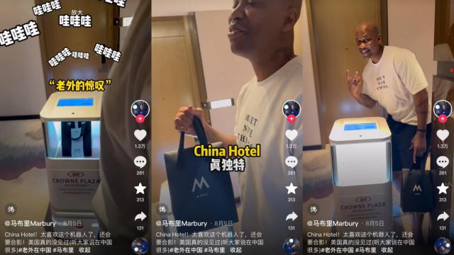 知名 NBA 明星马布里从酒店机器人处接到外卖后也说:“我太喜欢这个机器人了,还要拍照!美国真的没见过。我听说中国有很多。”