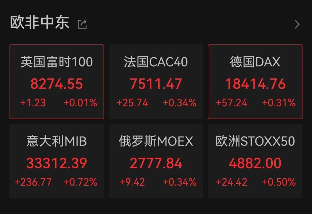 此前,欧洲股市集体上涨。截至发稿时,德国DAX上涨0.31%,法国CAC40上涨0.34%,英国富时上涨0.01%。