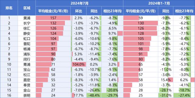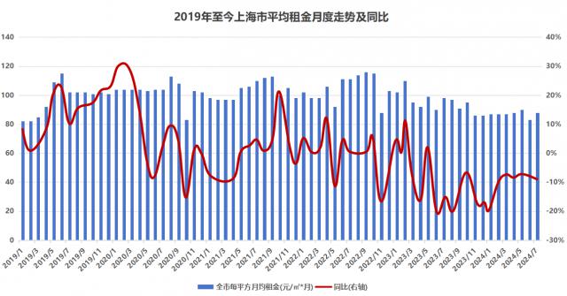 7 月上海全市挂牌租赁住房平均租金为: 88.15 元 / 平 / 月份,环比增长 同比下降5.2% 8.7%,下降幅度扩大 1.2pct,与 2023 与年平均租金相比,年平均租金下降。 7.4%。