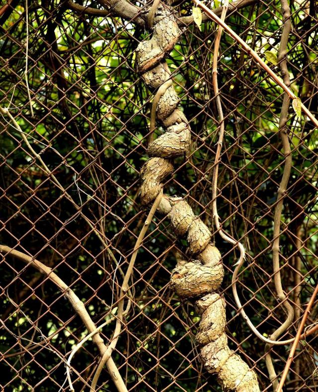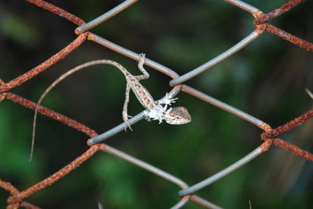 铁网上的变色树蜥蜴,盛开的千里光和攀爬纠缠的使君子。南兆旭摄