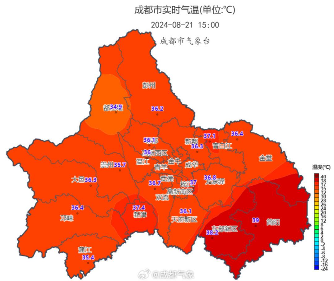 预计8月22日至26日,盆地最高气温可达35-39℃,其中资阳、泸州东部、自贡东部、内江东部、成都东部、遂宁南部、广安西部、达州南部可达40℃以上。