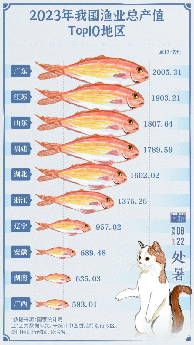 从 2023 广东、江苏、山东等沿海城市是我国渔业最发达的地区,年渔业总值前十。广东省就是其中之一 2005.31 总值1亿元稳居第一。而且湖北、湖南作为内陆地区,同样展现出强大的渔业实力,各自位居我国渔业总值第五和第九。湖北省在长江流域拥有丰富的淡水资源,位居全国最大的淡水渔业之列,其特色水产品包括龙虾、鳗鱼等。另外,新疆依靠冰川水养殖的三文鱼、高白鲑鱼、梭鲈等冷水鱼,更是火到了国外。