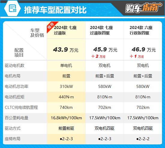 从综合配置和价格来看,编辑更推荐七座过道版的入门级车型。进一步提高了两款双电机四驱车型的动力性能,的确能带来更好的加速感。然而,考虑到中大型 MPV 车型本身主要是推动舒适乘坐体验的卖点,再结合两款车型超越。 45 一万元的价格,以及与入门级车型完全相同的配备性能,整体性价比不高。此外,双电机四轮驱动版在续航能力上与入门级车型存在差距,这意味着充电频率更高,日常使用方便性更差。