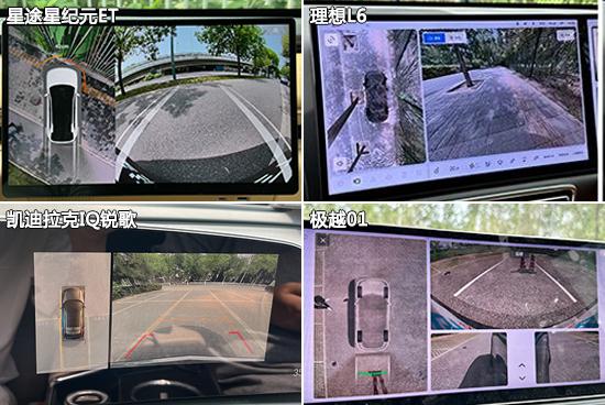 就影像辅助系统而言,四款车都配备了 360 ° 全景图像系统还配备了停车辅助线,控制了画面畸变,显示效果充分清晰,实用性令人满意。其中,极限 01 同一个屏幕可以显示俯视角、行驶方向和车辆左右两侧的画面,更直观地观察车辆周围的情况。