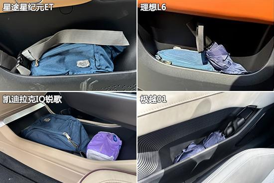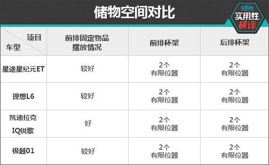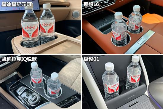 车内储物空间方面,IQ 锐歌整体收纳空间(杯架除外)最多,星纪元 ET 紧随其后,理想 L6 和极越 01 储物空间较少。在实际测量过程中,只是 IQ 锐歌的内部空间规划合理,所有固定物品都可以找到合适的地方放置。其他三款车都没有专属空间放墨镜,因为没有眼镜盒。